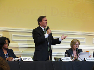From left to right, Mayoral Candidates City Councilwoman Jan Perry, former KRLA Talk Show Host Kevin James and new look City Controller Wendy "The Valley Greuel" (What is the "Private Citizen/ Political Consultant" John Shallman rate for "extreme candidate makeovers"?) Photo by Phil Jennerjahn.